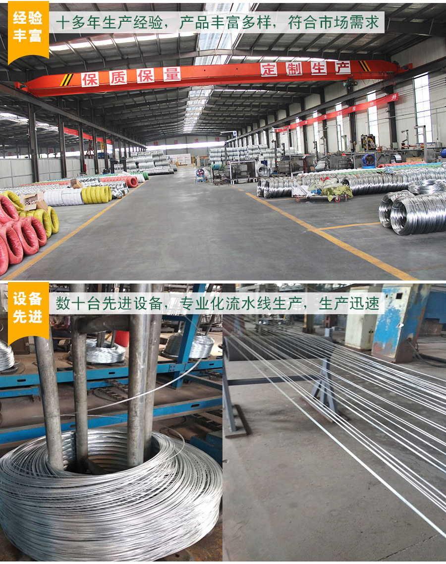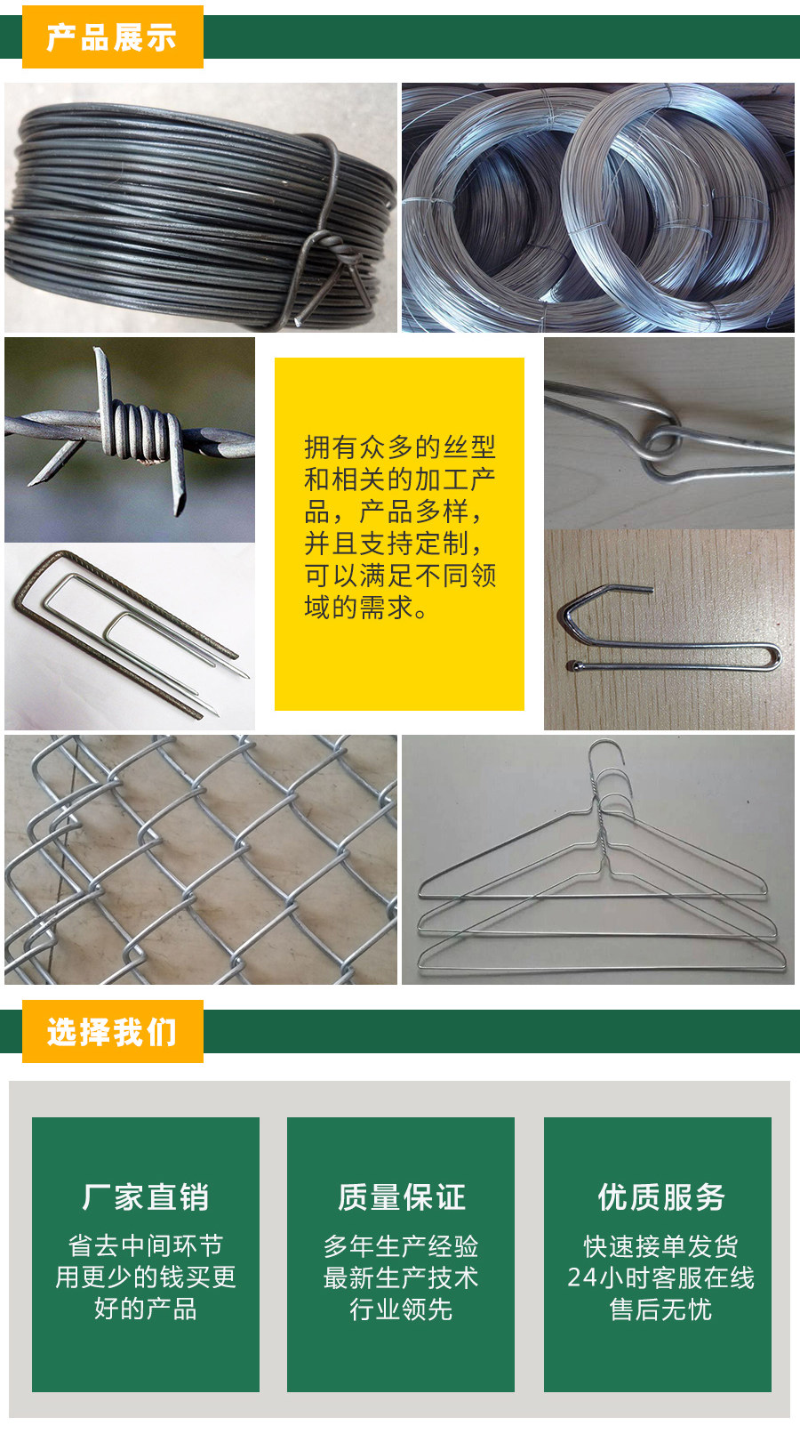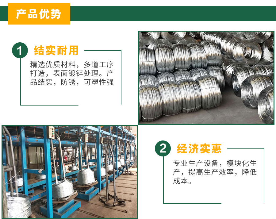 涂塑絲介紹:包塑絲選用優(yōu)質(zhì)鍍鋅絲做原材料,經(jīng)過深加工處理使塑料與鍍鋅鐵絲牢固的結(jié)合在一起,具有抗老化,抗腐蝕,防龜裂等特點(diǎn),使用壽命是冷熱鍍鋅鐵絲的幾倍,該產(chǎn)品的品種和顏色,可根據(jù)用戶需要訂制。
